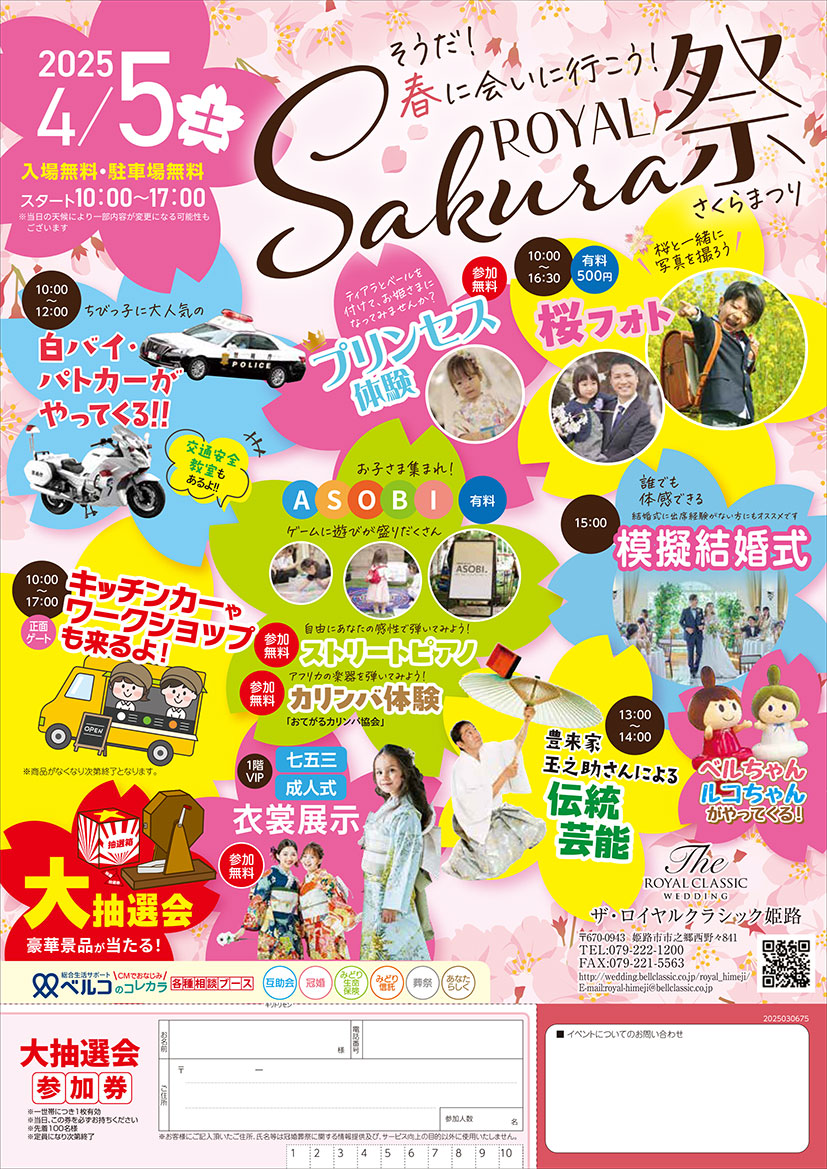 | アクセス | ・姫路バイパス南ランプより10分 ・山陽道姫路東IC出口より15分 ・JR姫路駅南口とザ・ロイヤルクラシック姫路間の無料シャトルバスを運行しております。(30分ごと)所要時間5分 ※結婚式のある日のみ運行。お問い合わせください。 |